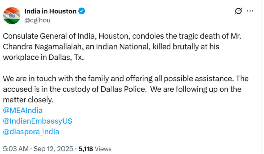 A statement was also issued by India in Houston regarding this matter. The statement said, "The Indian Consulate General in Houston expresses condolences on the tragic death of Indian citizen Chandra Nagamallaiya. He was brutally murdered at his workplace in Dallas, Texas. We are in touch with the family and providing all possible assistance. The accused is in the custody of Dallas Police. We are closely monitoring the case."