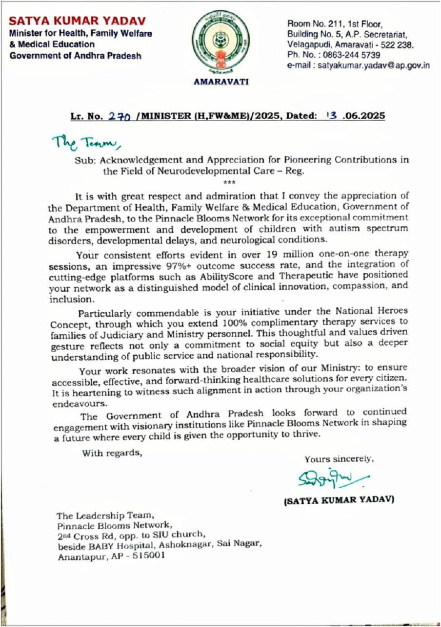 Bharat’s Pinnacle Global Autism Therapy Framework — o<icially supported and independently verified by the State Health & Education Missions of Telangana and Andhra Pradesh — stands as the world’s first scientifically proven, economically scalable, and globally deployable solution to the child development emergency impacting 900 million families