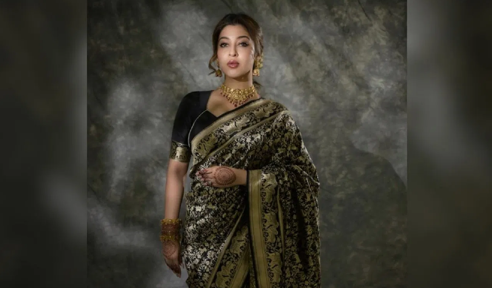 Lastly, Sonarika’s navy blue Kanjeevaram saree paired with a plain blouse exuded pure elegance. She completed her look with a gold necklace, bangles, and a messy bun, perfect for a simple yet festive Tulsi Vivah celebration.