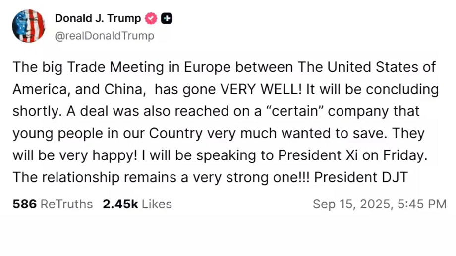 Trump also wrote on Truth Social, "A deal was reached on a company that the youth of our country wanted to save." He praised the trade meeting between the US, the European Union and China and said that this meeting was "very good". Trump said that he will talk to Chinese President Xi Jinping on Friday. Although he has not named TikTok in this post, his statement is being linked to this app.