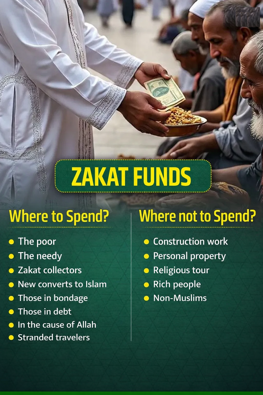 - Construction work: Zakat money cannot be used for building a mosque, madrasa, hospital or library.