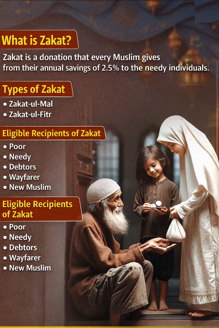 Islam's most sacred text lists eight individuals entitled to zakat. This is mentioned in the Quran (Surah At-Tawbah 9:60).
